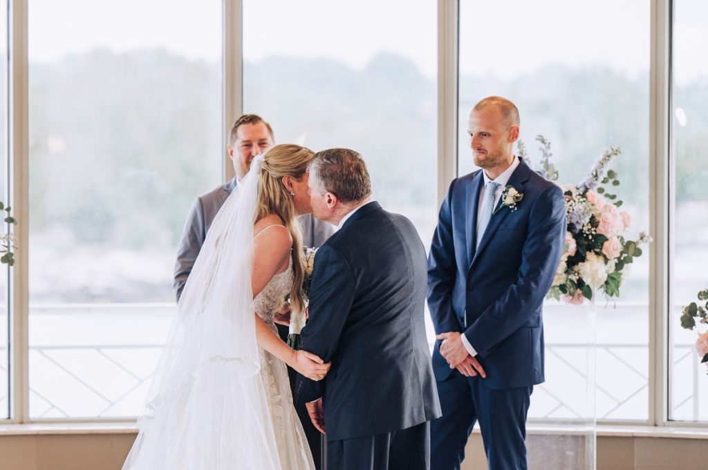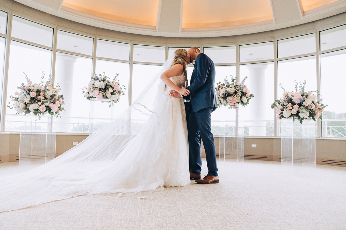 Laura and Kevin’s wedding day at the Glen Island Harbour Club in New Rochelle, NY, was a blend of historical elegance and modern comfort, set against a picturesque waterside backdrop. The weather was hot and partly cloudy, perfect for their stunning outdoor photo session yet warm enough to make everyone appreciate the air-conditioned sanctuary during the ceremony.