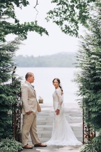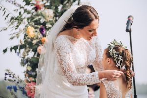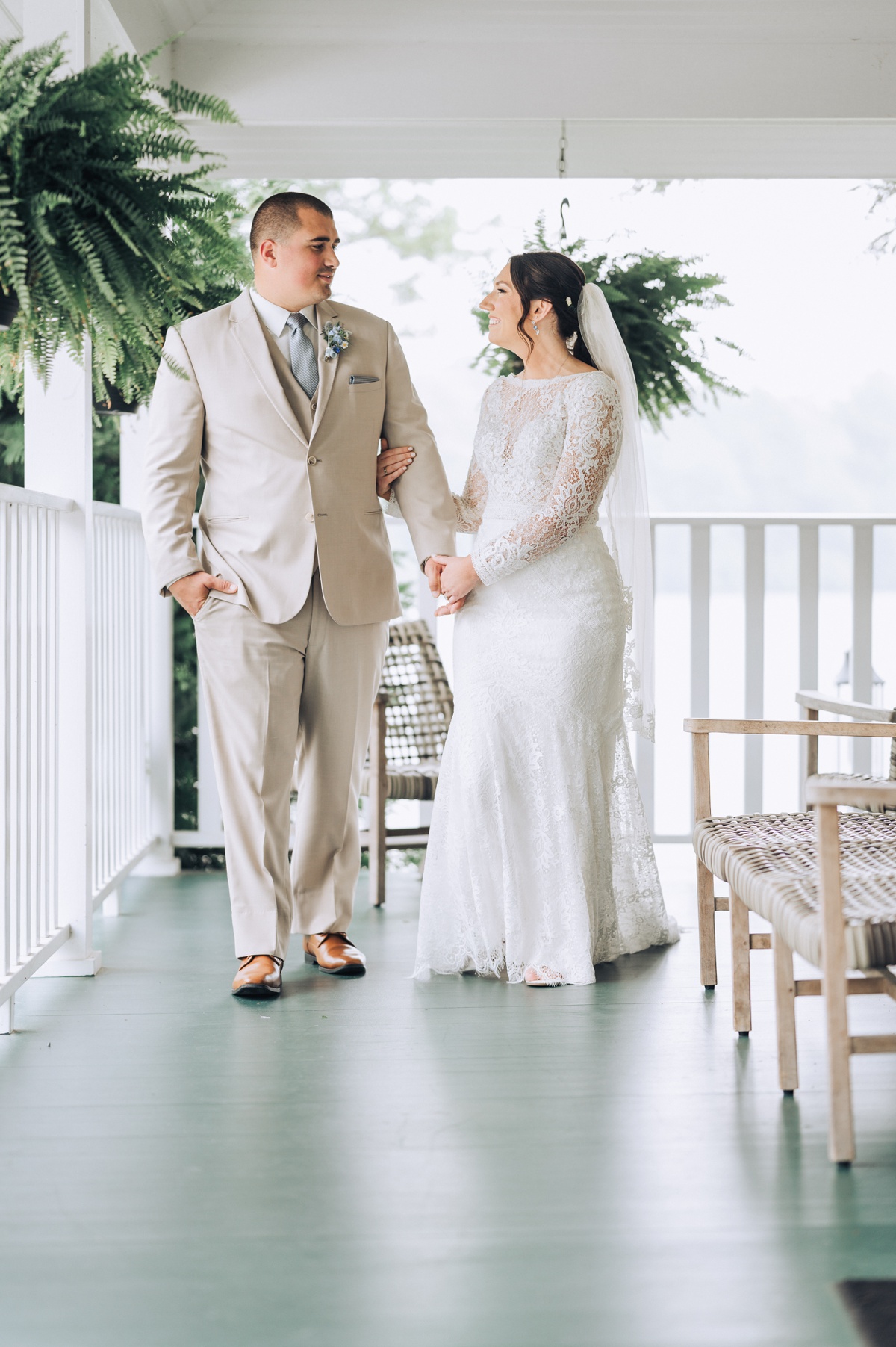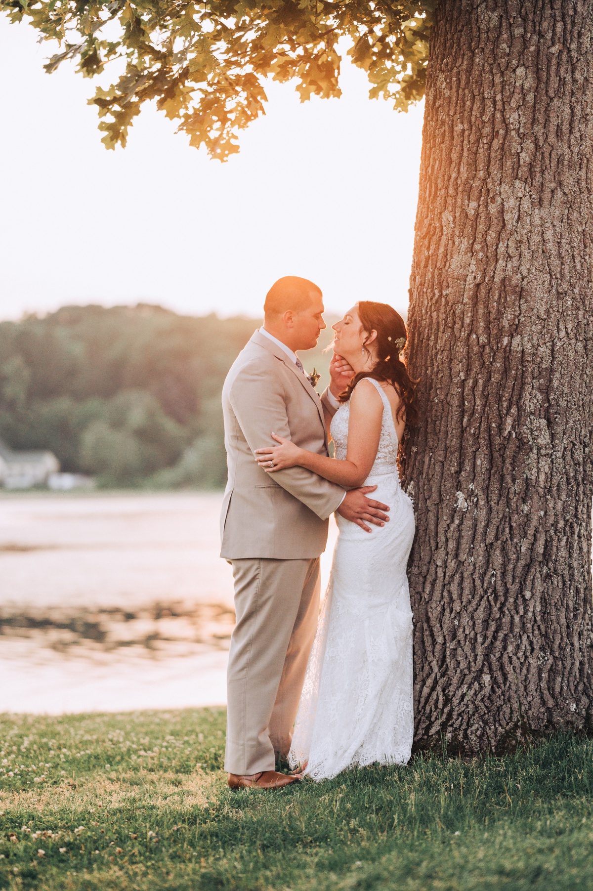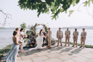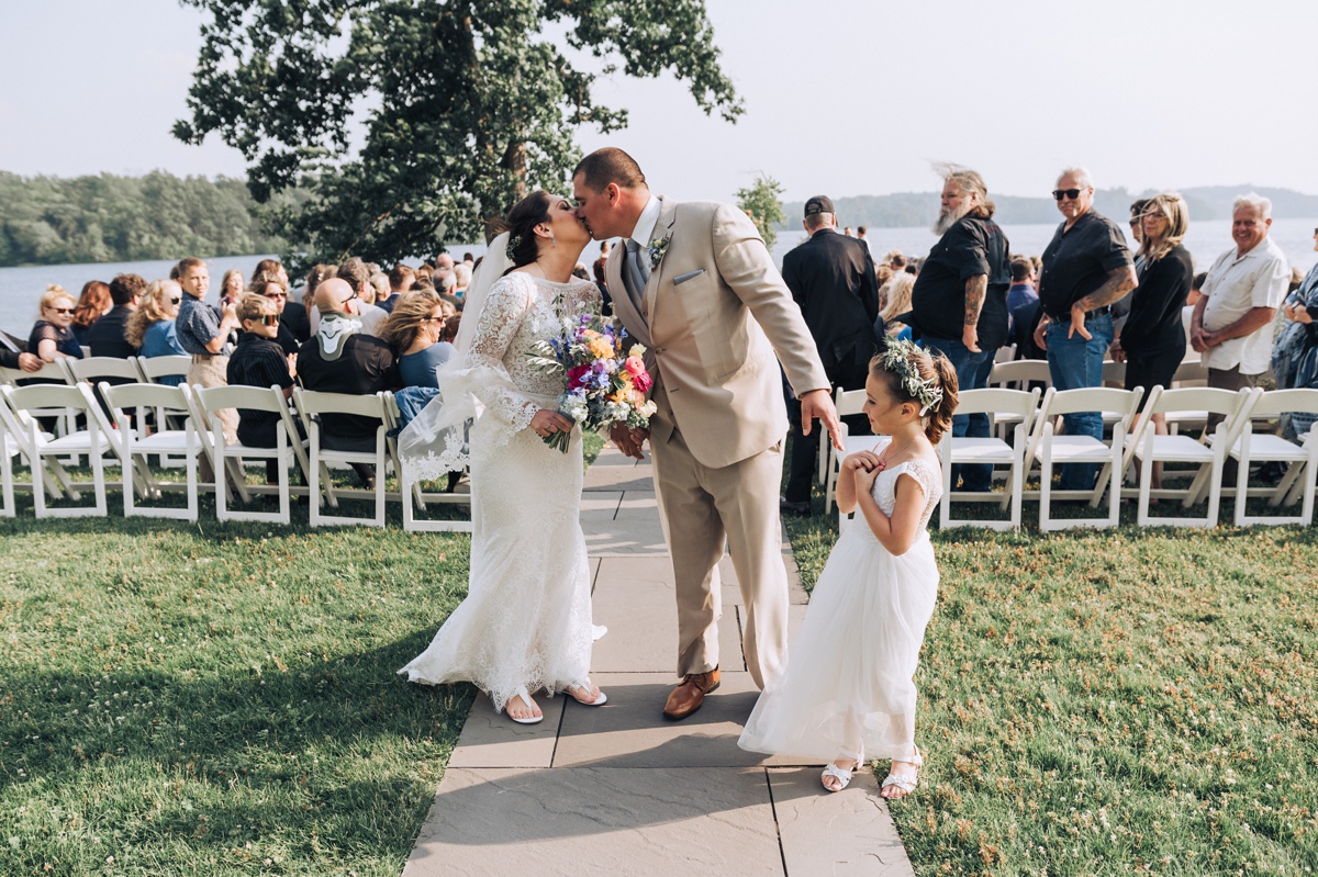 Perched on a peninsula near the lake, their ceremony took place under the bright sun. The winds added a whimsical touch, rustling the leaves and creating a romantic atmosphere as Laura and Austin exchanged their vows.